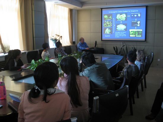 4月30日上午,Dennis Gray教授在学院二层会议室作了题为“Somatic Embryogenesis & Transformation in Grapevine”的学术报告。报告会由学院副院长王西平教授主持。葡萄胚状体发生方式是实现葡萄转基因育种的必要前提,Dennis Gray教授领导的团队致力于研究不同因素对葡萄胚状体途径再生效率及遗传转化效率的影响,以及将不同功能基因转入葡萄胚状体,获得改良的转基因植株。报告会上,Dennis Gray教授还和与会师生进行了广泛深入地交流。